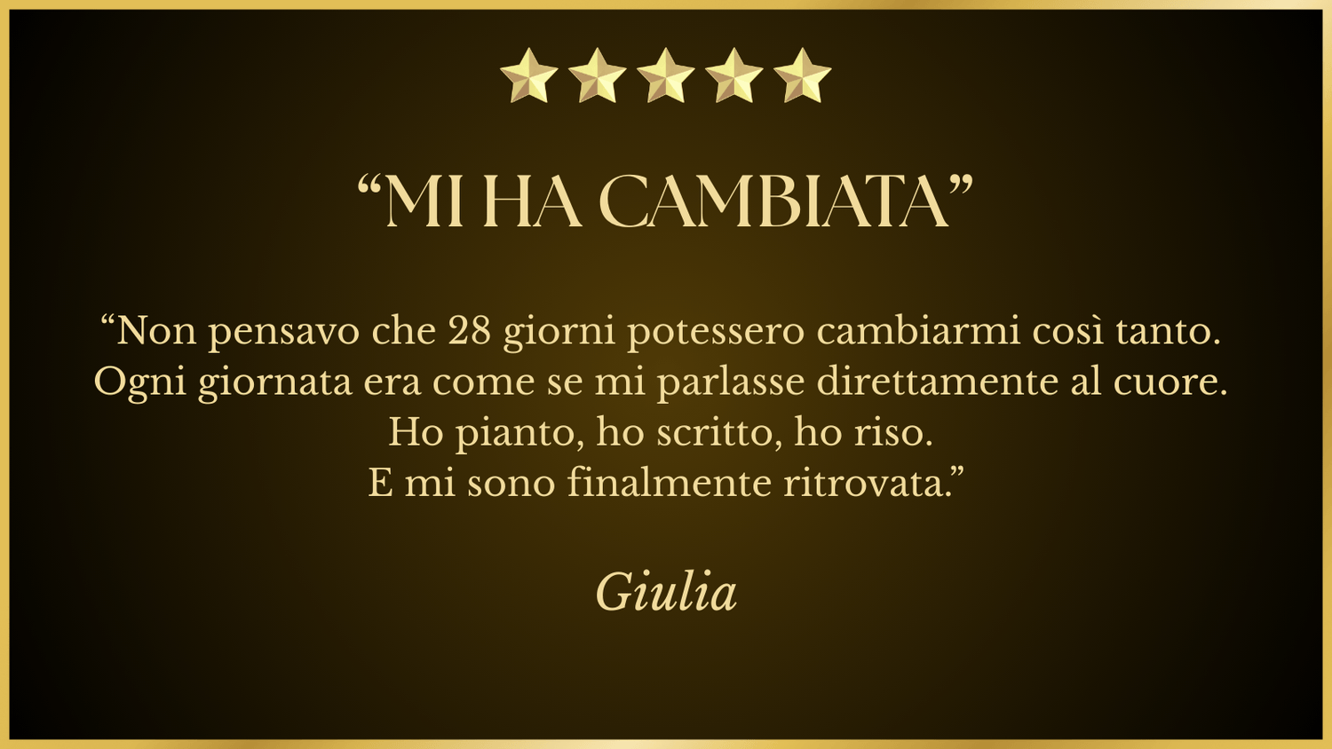 • 28 Giorni + 1 di corso ripetibili tutto l'anno, per riconnetterti con Te stessa